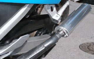 | デイトナ製サイレンサー装着図 コメント:掲示板より抜粋 NSR250用のディトナのサイレンサーです 1000円だったので入札したら そのまま落札してしまいました 商品が届いたらJMCAの認定品でした ひょっとしたら無改造で装着できるのではと 淡い期待を抱いていたのですが、無理でした フランジの穴をヤスリで長穴に加工し フランジから飛び出しているパイプを 短く切ってやっと装着できました |