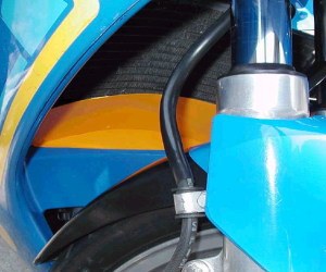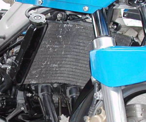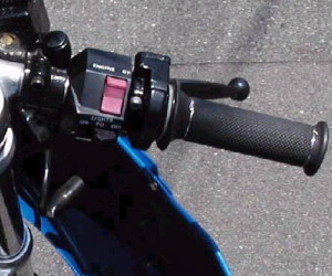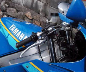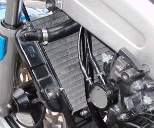 | オーバークール対策完結!&キルスイッチ変更 コメント:メールより抜粋 オーバークール対策のバージョンアップ(?) 完成しましたので写真をお送りします 今回はスライド式にしてみました 裏側にガイドレールを取り付け表からビス1本をゆるめると 好きな位置に調整できるようになっています 欠点は結構重たいことです いくらアルミでも色々付けるとかなりの重量になります これからの季節は必要ないので秋まで保管しておきます 3MAのラジエターの上部ステーも作り直しました ちょうどアッパーカウルのふれ止め用に フレームにナッターでナットを埋め込んでありましたので 左右ともそこからステーを出しました これでラジエターの上部がすっきりしました YZ80のキルスイッチも取り付けライトスイッチは 2極開閉式のスナップスイッチを水温計の下に取り付けました スイッチの上でライト及びポジションオン 真ん中でオフ、下でポジションオンとなります |