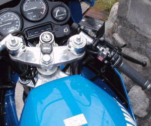 | ハンドル位置変更につき.. コメント:メールより抜粋 ステーはアルミ板で制作してアルマイト風に塗装してみました 水温計カバーは黒色の缶スプレーのキャップを加工してあります |