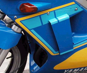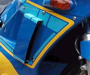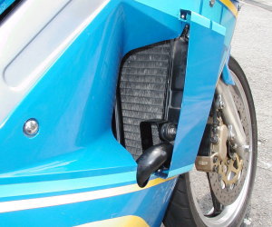 | 3MA(後方排気)用ラジエター装着! コメント:メールより抜粋 アンダーカウルを取り付けてから判ったのですが ラジエターは左右対称ではないのか、カウルがそうなのか 結果的には2センチ位右寄りになってしまいました でもカバーで隠れるので気にしないようにします カバーは1oのアルミ板で作り裏から ブラインドリベットで止めてあります デカールはカッティングシートで作りました ステーは3oのアルミ板を使用しています |
