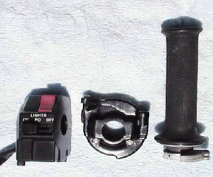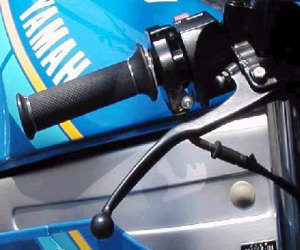 | ハイスロ化&オーバークール対策! コメント:メールより抜粋 スロットルをハイスロ化しました 3XVの物を使えば簡単みたいですが それでは芸がない(本当はお金がない)ので 頂き物のYZ80のスロットルと スロットルホルダーを大改造して取り付けました YZの物はアクセルワイヤーが90度曲がった タイプですので、その曲がり部分を切り取り エポキシパテとプラリペアで穴埋めし 新たに1KTに合うように穴を開け直し ワイヤーの止めと上蓋の止めのタップを立ててあります スロットルはエンド部がふさがったタイプですので 貫通させてあります また全閉位置あわせのため扇形の部分も 少し削ってあります 1KTの右スイッチはアクセルホルダー部分を 切り取ってあります それでも全体の幅がありすぎるのでグリップを ハンドルの端まで移動してやっと取り付きました 結果的にハンドルの幅が左右それぞれ15o位 広くなったことになります オーバークール対策はとりあえず 湾曲させたアルミ板をラジエターの下側が 1/3くらい隠れるように取り付けました 今日は結構暑かったですがちょうど良い位みたいです 水温の上昇具合を確認してから 再度もう少し凝った物を作るつもりです |
