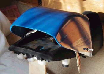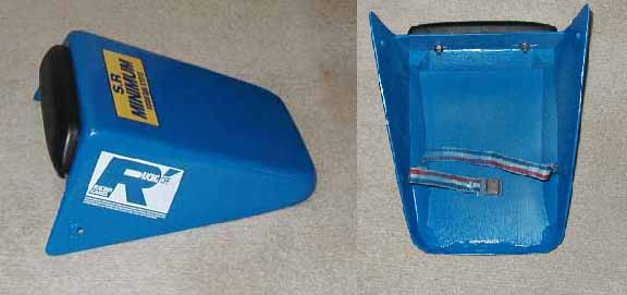 | (更驚)シングルシートカバー改造 コメント:掲示板より抜粋 ツーリングの際一番かさばる荷物は カッパなんですよね そこでカッパが収納できるように シングルシートカバーを大型化しました 例によって材料はベニヤ板です 後部の固定がベルト式ですのでベルトをはずして 前方にリフトアップする事により 荷物の出し入れが出来るようになっています シートのスポンジのくりぬきと併せて かなりの収納が可能です |