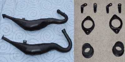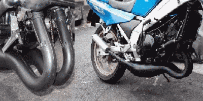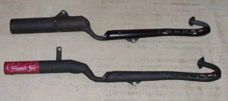 | XLR用オリジナル(汗)マフラー コメント:メールより抜粋 XLR80Rがあまりにもかったるいので マフラーを改造してみました 上がノーマル、下が改造したものです エキパイ部はXLR80Rのもの サイレンサー部はXJR400の社外品のマフラーを使用しました 鉄板を曲げてテーパー状の筒を2個作り 角度を付けて溶接して エキパイとサイレンサーをつないであります 音はうるさくもなくかなり良い感じの音がします 低速から高速まで以前よりパワー感が出ました 高速の伸びも良くなり最高速も5キロアップしました たかが5キロですが最高速80キロに対しての5キロですから その差は大きいです |
