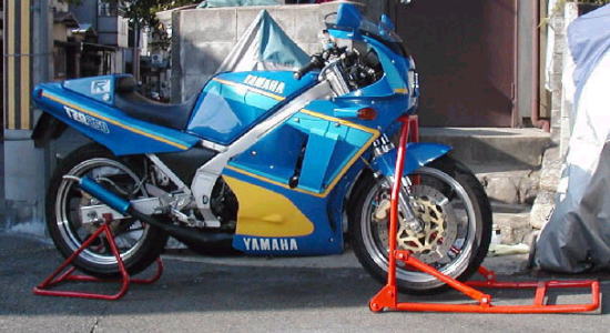 | 自作バイクジャッキ コメント:メールより抜粋 今日は前後リフトアップしてホイルの清掃をしていましたのですが 最近スタンドの話題が出ていますし VUSさんところには私のスタンドの写真がないので 古いものですがスタンドの写真をお送りします |