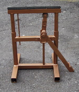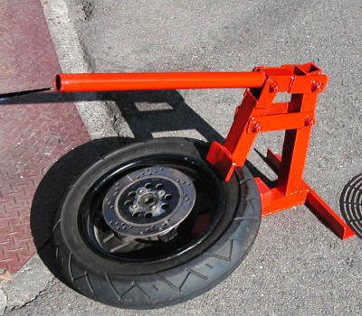 | 自作ビートブレーカー コメント:メールより抜粋 ビードブレーカーを作ってみました 例によって設計図も無しで写真を見ながら 廃材を利用して適当に作りました 試験的にKSRのタイヤでやってみましたが うまく落ちるようです |