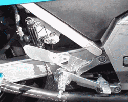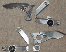 | コメント:メールより抜粋 ノーマルのステップをくの字型に切り取ります 10ミリ厚のアルミ板を形を合わせて20ミリ幅で くの字に切り出します ステップの前半と後半の間にアルミ板を挟んで溶接します 同じように作っても右と左のフットレスト取り付け位置が あわず苦労しました |