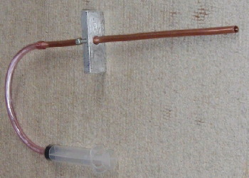 | 自作フォークオイル油面調整器 コメント:メールより抜粋 フォークオイルの油面調整器です 材料は中古のエアコンの銅管 子供から取り上げた教材の注射器、耐油ホースです 耐油ホースもバイク用品店で買うと高いのですが ホームセンターで買えば十分の一くらいの値段で買えます アルミブロックの位置を調整して油面を合わせます 総制作費10円位で出来ました |