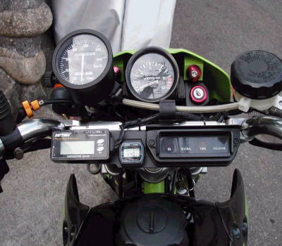 | KSR工作 その2 コメント:メールより抜粋 KSRのメーター廻り完成しましたので 画像をお送りします なんかごちゃごちゃしていてあまり 良い感じではありませんが 無理矢理組み込んでみました 必要な情報はこれで十分に 得られるのでまあいいかなと(笑) スピードメーター:TS125 タコメーター:TDR250 メーターケーブル:KDX125SR インジケーターランプ:TZR2503XV用切り取り加工 水温計:デイトナ (初めから付いていました) 時計:カシオ(笑) こうしてみるとカワサキ製は メーターケーブルのみなんですね |
