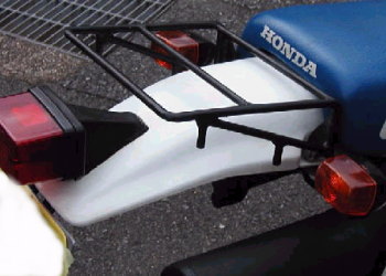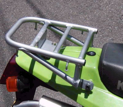 | KSR工作 その3 コメント:メールより抜粋 KLE250アネーロのリヤキャリアの 不要な部分を切り取り KSRに合わせてアングルで ステーを3カ所作り溶接してあります フェンダーは裏からシートレールに 固定してあるのですが そのボルトを長い物に代えて シートレールより飛び出すようにし そのボルトにタップをたてた円柱をねじ込み キャリヤを上からその円柱に ネジ止めしてあります リヤカウルには円柱が通るように 穴を開けてあります |