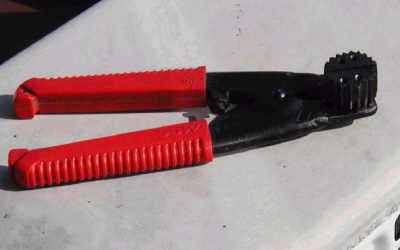 | 自作キャリパーピストンプライヤー コメント:メールより抜粋 刃が欠けて使い物にならなくなったクリッパーを 加工して、握ると先端が開く様にし 鉄で作ったギヤ状のアタッチに焼きを入れて 取り付けてあります ピストン内に挿入してレバーを握るとアタッチが開いて ピストンに噛み込むので工具を回すと 固着したピストンが回るようになるというものです |