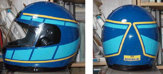 | 自家塗装ヘルメット コメント:メールより抜粋 先日塗装したヘルメットの写真をお送りしておきます バイクとお揃いのゴロワーズカラーにしてみました 本体はMCペインターのフレンチブルーで塗装し カッティングシ−トでデザインしてみました |