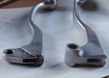 | (驚)予備クラッチレバー製造 コメント:メールより抜粋 我が記念館にはどういう訳かレバー類がありません 先日の転倒を機にやはり予備レバーが必要と実感しました 友人より不要なレバーを20本ほど貰ったのですが 一つとして同じ物はありませんでした(涙) そのうち形状のよく似た(おそらくYZ125用) のクラッチレバーを改造して予備にしました 左が改造前、右が改造後です M10のナットを少し薄くし、丸く削って エポキシ接着剤で接着してあります 穴はブッシュが入るように広げました |